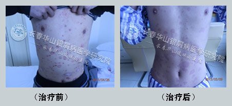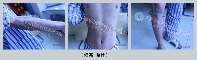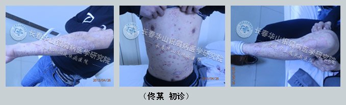 5年前,佟先生下肢刮破后出现红色粟粒样大小的点状丘疹,逐渐蔓延到全身,曾在多家医院治疗,口服药和外用药(具体用药不详),3个月前病情加重,于2013年4月26日来我院接受系统治疗。