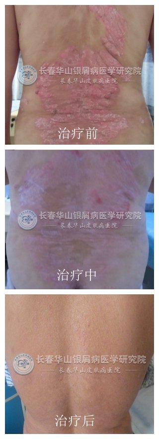 治疗了一段时间后,老陈背后的皮损症状有了明显好转,老陈以为已经康复,便停止了治疗。当时天气转冷入秋,秋冬季是银屑病比较容易发病的季节,皮损消退没多久又再次来袭,老陈用药膏应付着,也没去医院治疗。之后的几年,银屑病反反复复,老陈也尝试过各种游医偏方,始终不见痊愈,并且由于长时间使用激素类药品,身上的皮损症状不断扩大蔓延,瘙痒无比。