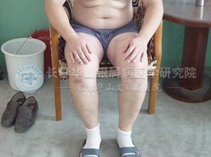2010年高考结束时病情发展到小腿也出现皮损,一直到2010年11月份(这中间没有吃任何药),我没有征兆的发烧,最高烧到四十二度。连夜去医院,因为知道发烧会加重银屑病的病情,所以主动要求打针,赶快退烧。凌晨两点吃的药,早上不烧了。但中午又开始烧,吃上药又不烧了。