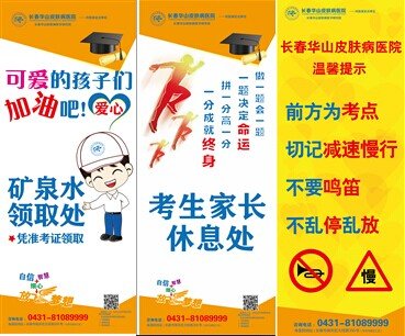 另外,在考场外,长春博润皮肤病医院银屑病治疗中心还拉起横幅为高考生加油。有“前方高考考点,切记减速慢行,不要鸣笛,不乱停乱放”的路段提示牌;也有“预祝同学们考出优异成绩”的祝语;也有“遇到会做的题目,仔细;遇到不会做的题目,冷静。只求‘少丢分’,不求‘得高分’”的温馨提示。